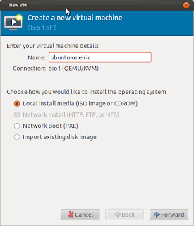 - Browse and select the ISO located at /var/lib/libvirt/images/ubuntu-11.10-server-amd64.iso, OS type "Linux" and Version "Ubuntu 11.10 (Oneiric Ocelot)":